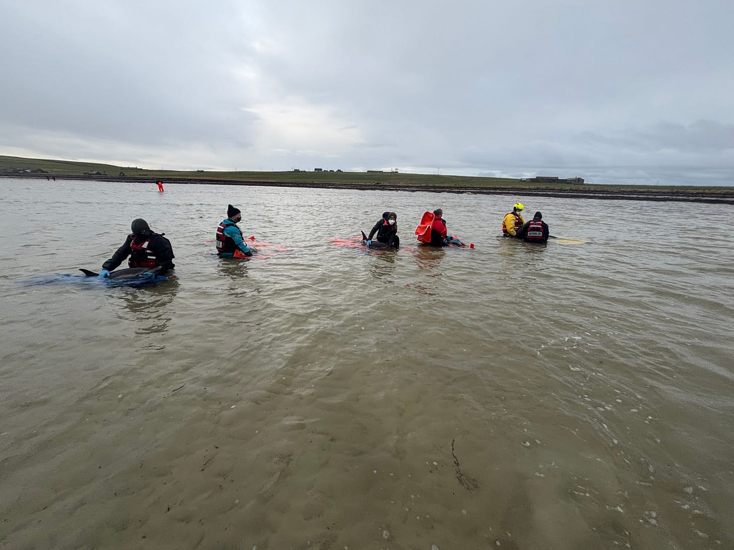 And another complication, something I had not known: dolphin muscles seize up when they strand, so they are likely to drown if simply let go in deep water. They also lose their sense of balance and often cannot stay upright, and this can also lead to drowning. So, not only must they be taken to sea together, but they must be gently supported by human arms while they move their muscles and warm them back up, and they must be rocked gently from side to side to help them rebalance themselves. And then, finally, they can be guided into the deep.