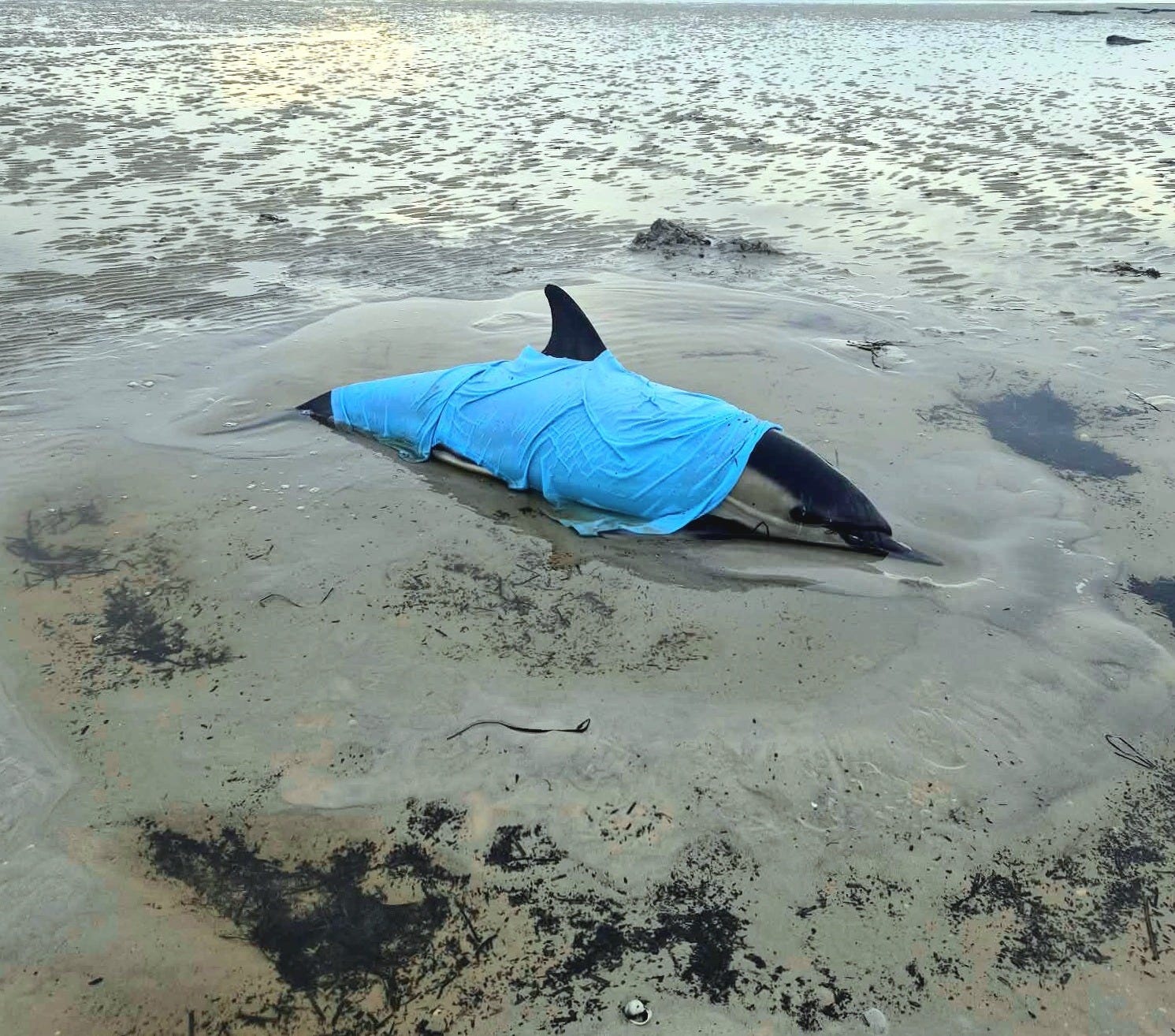 There are six altogether. Six common dolphins. One adult male, three adult females, and two female calves (one of whom is less than a month old), all of them stranded here on this shallow, sandy bay.
