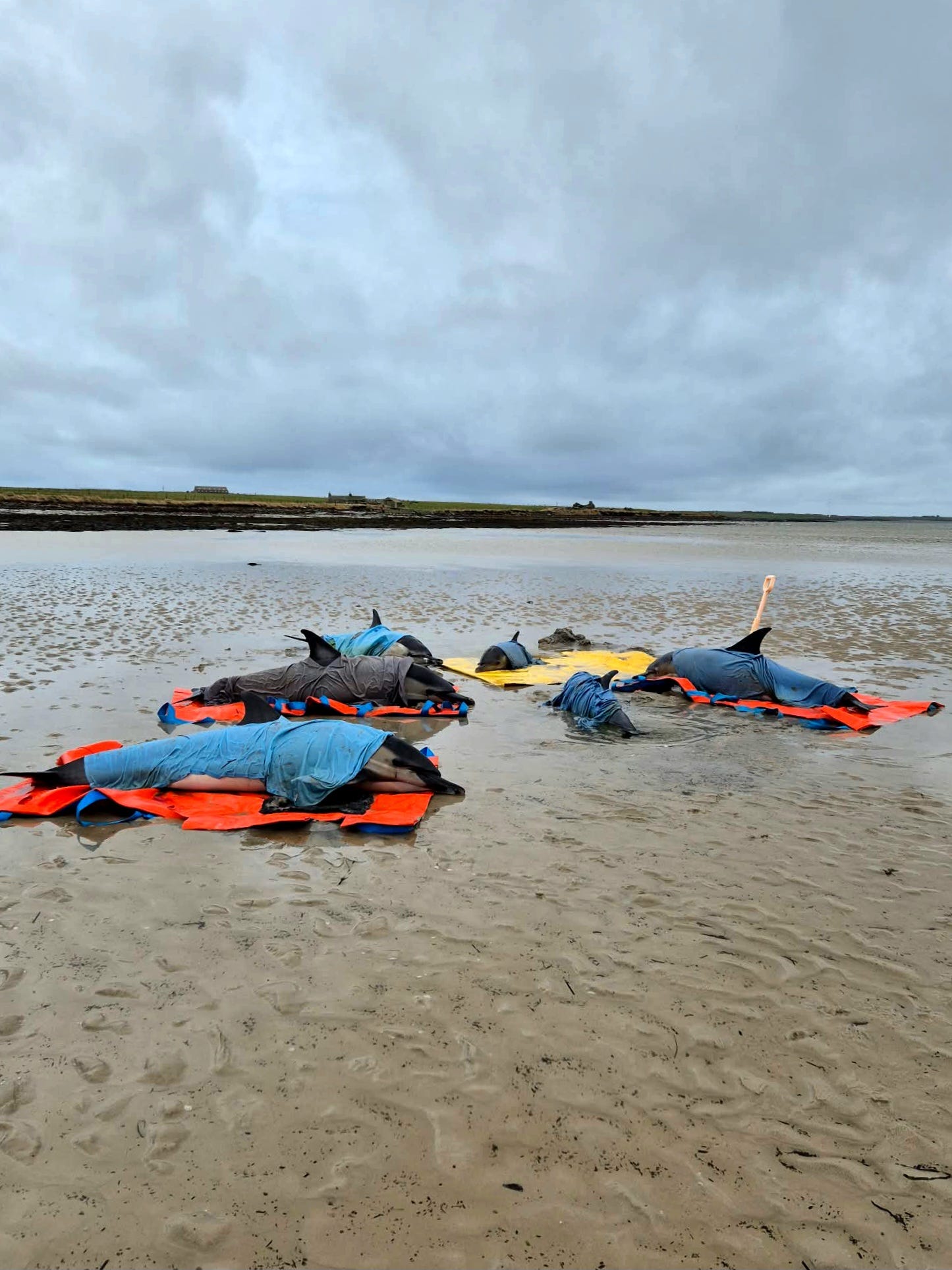 We know she is four-weeks(ish) because we can still see her foetal folds: pale, vertical stripes on her flanks where she was folded up in her mother’s womb3. Gently, I hold her head up—a surprisingly heavy head, given her small size—and keep her blowhole above the surface as the tide comes rolling in. While doing this, I accidentally cover her eyes with my forearms and she begins to squirm, her little fluke thrashing, and a medic tells me to move my arms back a little so that she can see the rest of the pod. When the other dolphins are in her sight line, she instantly calms down.